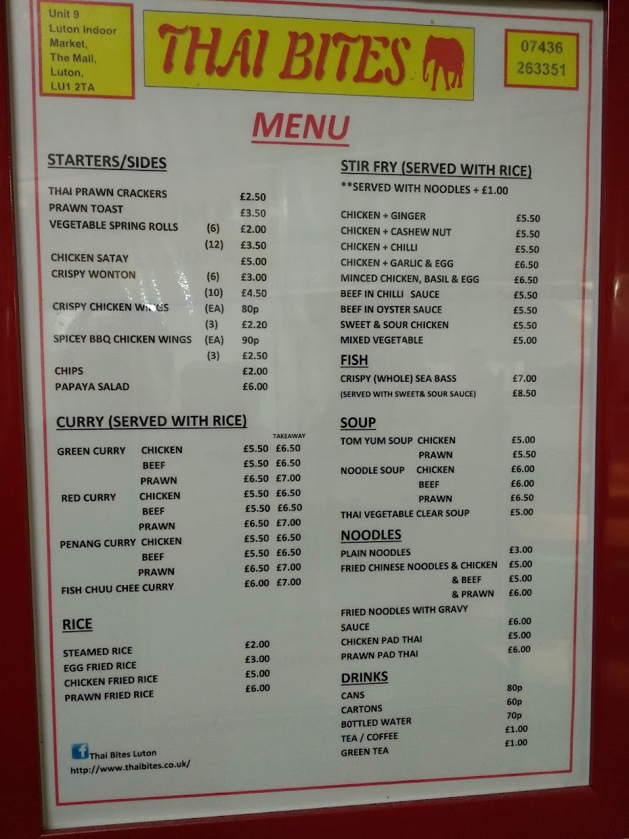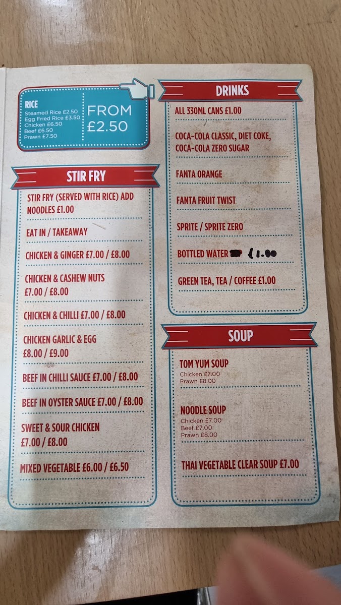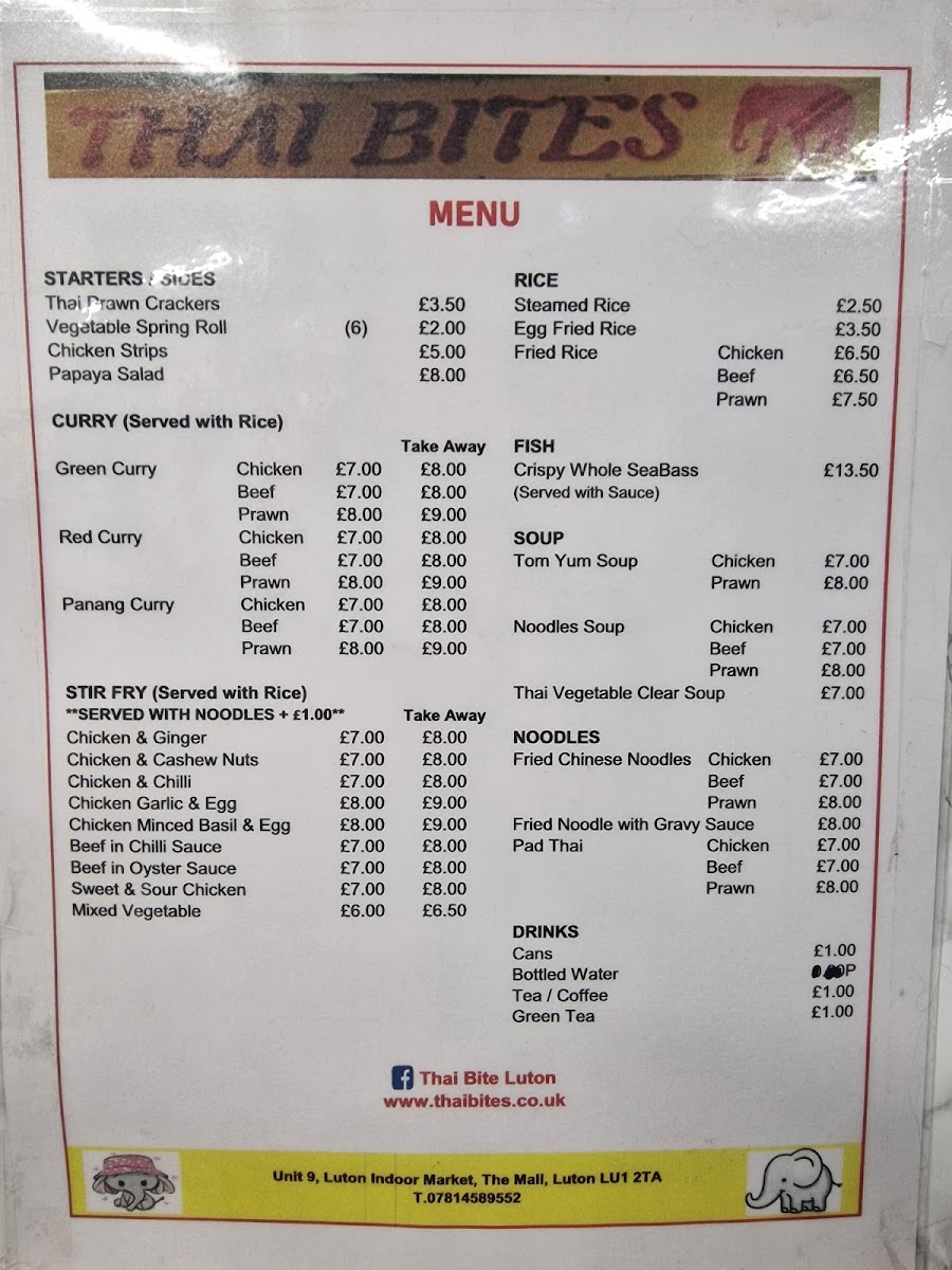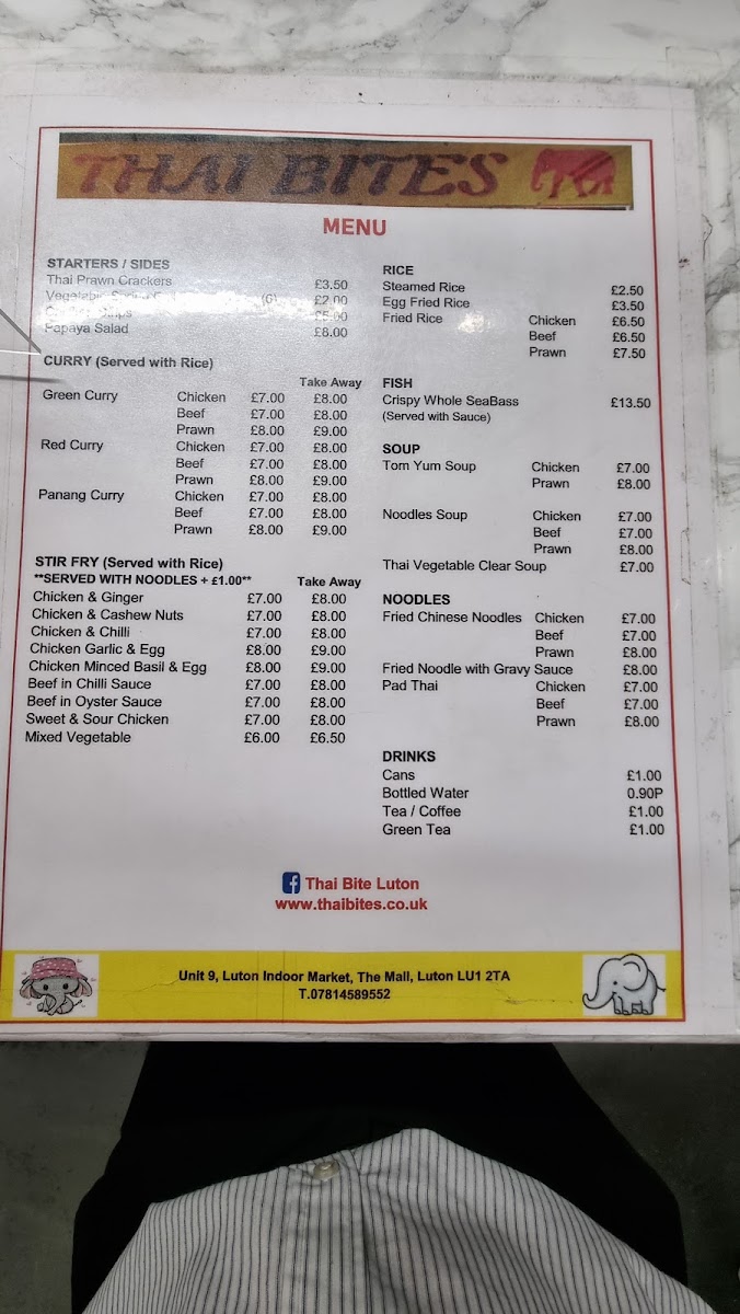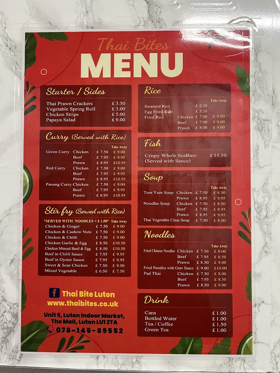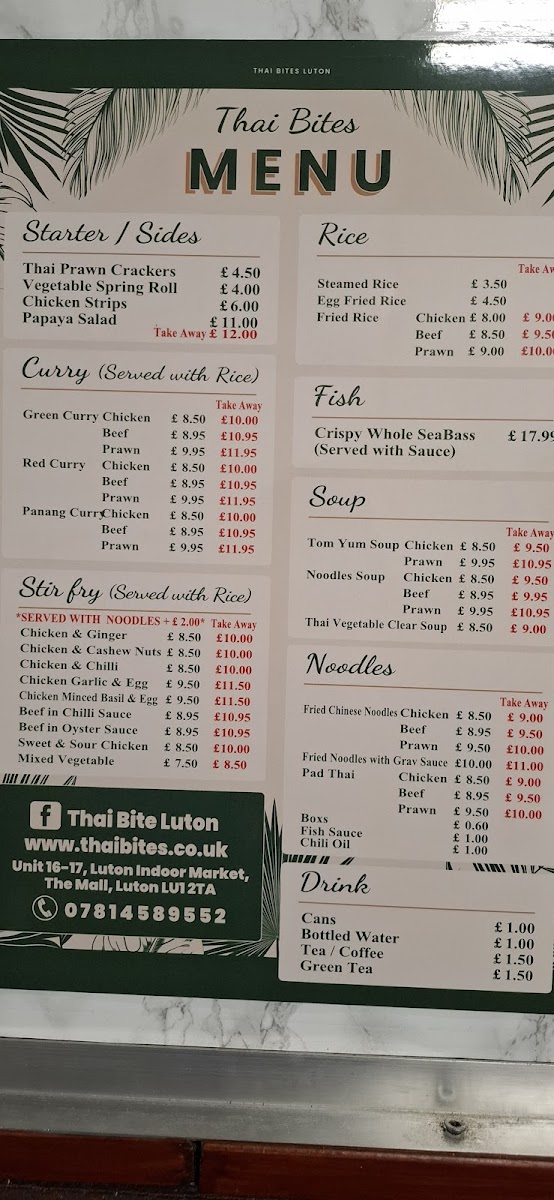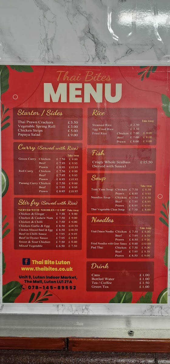 The menu at Thai Bites in The Mall, Luton offers a delightful selection of traditional Thai dishes with an array of flavors and textures. For starters, diners can enjoy the crispy Thai Prawn Crackers, Vegetable Spring Roll, and Chicken Strips, or the refreshing Papaya Salad. The curry options include the fragrant Green Curry, while the stir-fry section features a variety of tasty choices like Chicken & Ginger, Chicken & Cashew Nuts, and Chicken & Chilli, alongside options such as Chicken Garlic & Egg and Chicken Minced Basil & Egg. To accompany these dishes, guests can choose from simple Steamed Rice, savory Egg Fried Rice, or a classic Fried Rice. For a more substantial meal, the Crispy Whole Seabass offers a crispy, flavorful fish option. The soup menu includes comforting favorites like Tom Yum Soup, Noodles Soup, and the light Thai Vegetable Clear Soup. A selection of Fried Chinese Noodles, Fried Noodle with Gravy Sauce, and the ever-popular Pad Thai are also available for noodle lovers. As for drinks, there is a variety of soft drinks like Coca-Cola Classic, Fanta Orange, and Sprite, as well as Green Tea and bottled water. Additionally, Chicken Panang Curry adds a rich, creamy flavor to the menu, rounding out the diverse offerings at Thai Bites. The extensive menu provides something for every palate, all at reasonable prices for those seeking an authentic taste of Thailand.